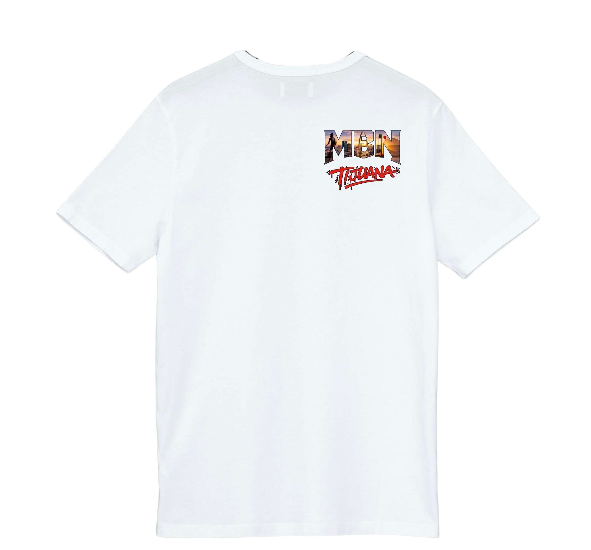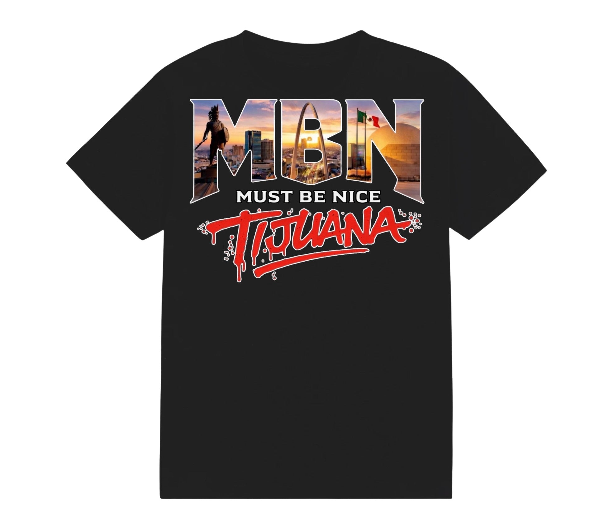 Make a statement with the MBN Must Be Nice Tijuana T-Shirt. Set on a classic black tee, this design features bold “MBN” lettering filled with vibrant skyline imagery and iconic Tijuana landmarks, finished with the signature Tijuana script in striking red graffiti-style lettering.